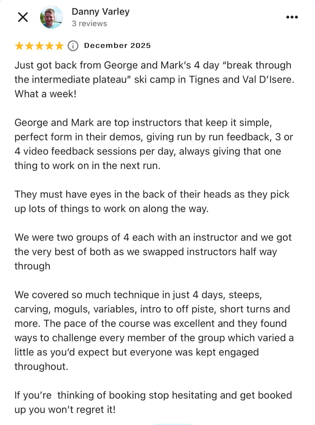 "straight forward, simple and clear instruction that was easy to translate into practise on the slopes. Very accessible and benefitted others in the group."