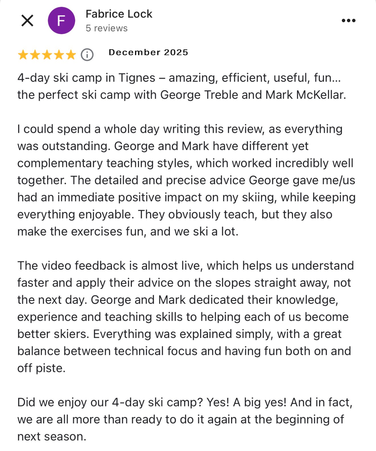 "Fab, I watch the videos regularly especially before a ski trip to give myself confidence ready to ski"
