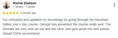 An amazing online Mountain Safety Course, makes good sense, was really well presented and makes food for thought, I want to do the practical course now! Thank George :)you