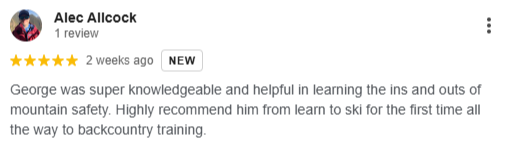 "Thoroughly recommend the A.S.A.T course with George. It helps provide the necessary foundations for off piste skiing/avalanche safety. The online course complements the in person sessions very well, and is both informative and engaging at the same time. Cheers George!