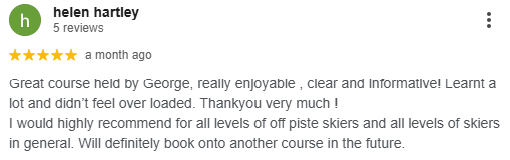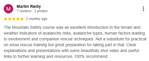" A great one day course to improve or refresh your mountain safety knowledge and get you thinking about decision making when going off piste. The online tutorials are the right length and full of useful info. Would definitely recommend."