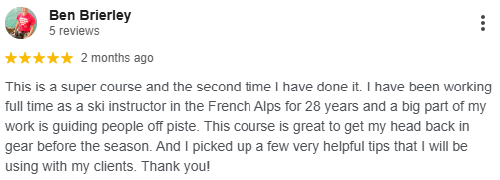 "I thought the course was great! I knew a little about mountain safety going into it but I learnt lots of new information which I'm sure is going to come in very useful. The information is presented in a way which is easy to understand and interesting. I will now be recommending this course to anyone who plans to go off piste."